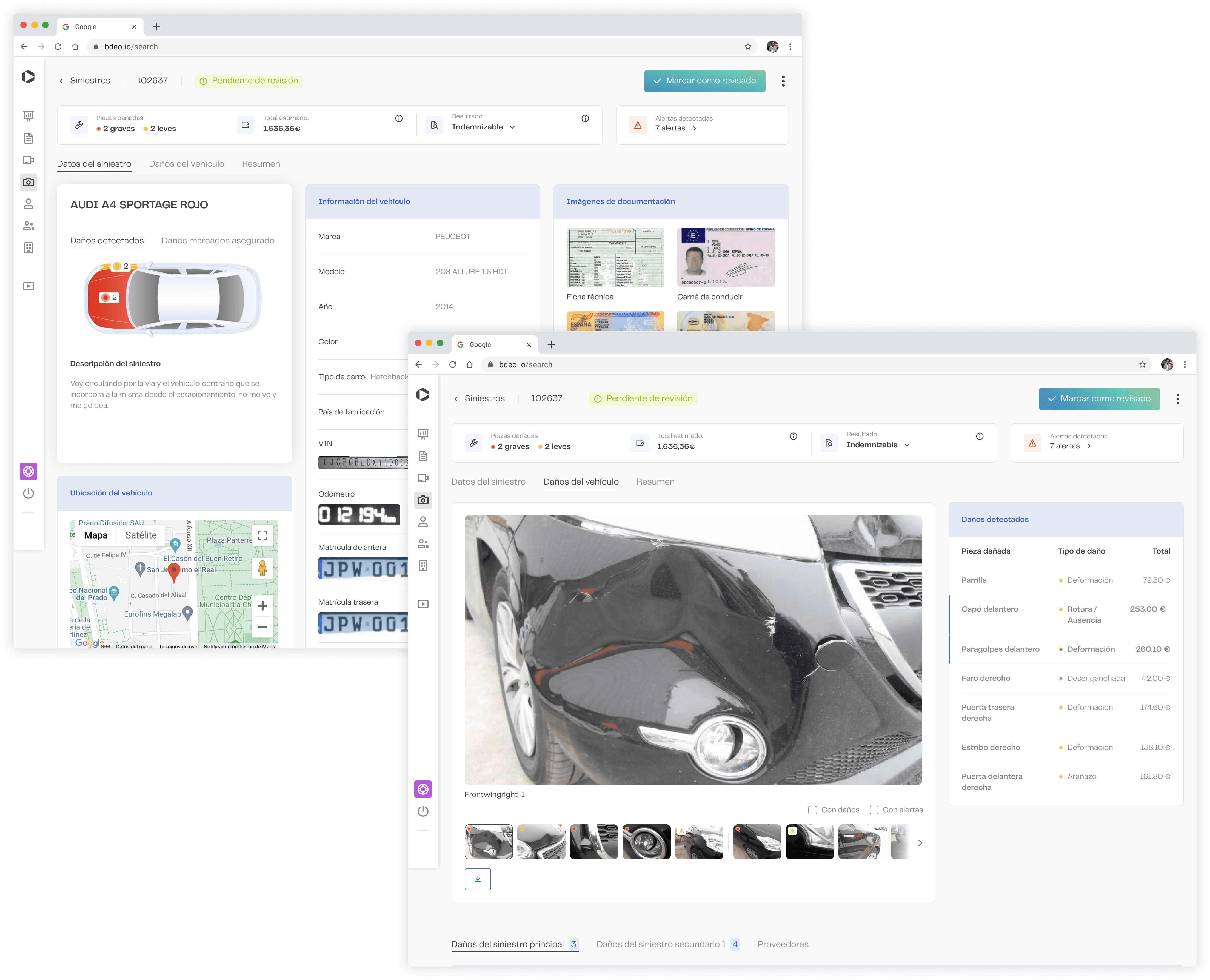 El dashboard de Bdeo era funcional pero lento de usar — los gestores de siniestros repetían los mismos flujos decenas de veces al día sobre una interfaz que no estaba optimizada para esa cadencia. Rediseñé la experiencia central priorizando velocidad de tarea y claridad de información, reduciendo el tiempo medio por gestión de 7 a 5.2 minutos. El resultado se convirtió en un argumento de venta directo con clientes enterprise del sector asegurador.